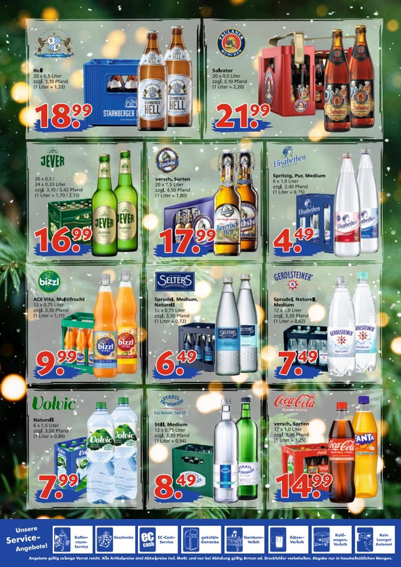 Bei uns erwartet Sie das Getränkeparadies, frisches und verrücktes, exotisches und trendiges . In unseren Getränkemärkten werden Sie bestimmt fündig. Neben einem reichhaltigen Sortiment an Biersorten, erlesenen Weinen und Spirituosen führen wir auch alle gängigen Softdrinks, Limonaden und Mineralwässer. Regelmäßig erfolgen Sonderangebote aus unserem Getränkesortiment.